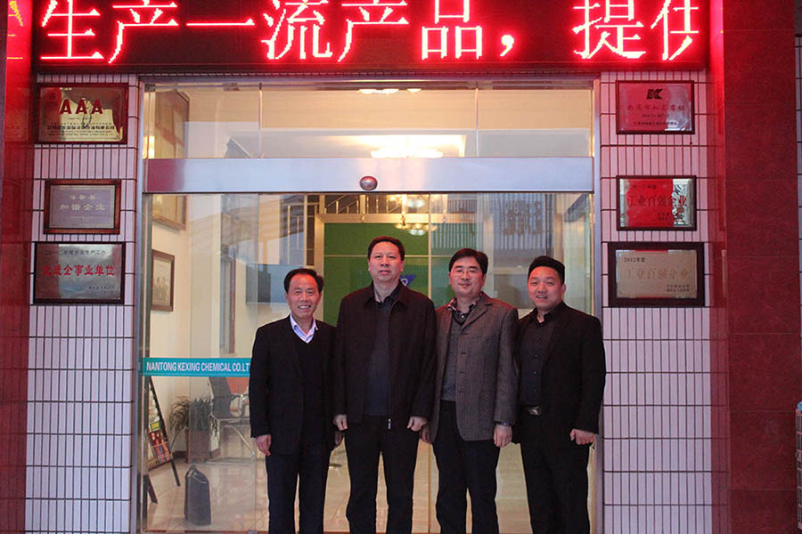图三 中国轴承协会秘书长周宇(左二)、中共白甸镇党委副书记 . 镇长刘建军(右二)、科星化工董事长吴龙铁(左一)、科星化工总经理傅士超(右一)